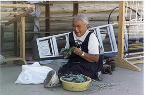 Sarah demonstrates weaving techniques to her