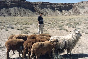Mary Black observes a ram leading some lambs.