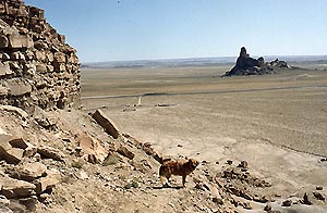 View from trail down Table Mesa. Note Natani hogan and corral nearby and Barber Rock across the road.